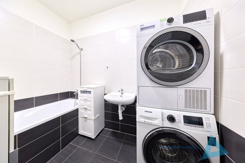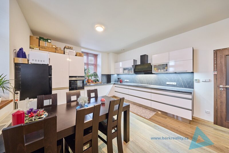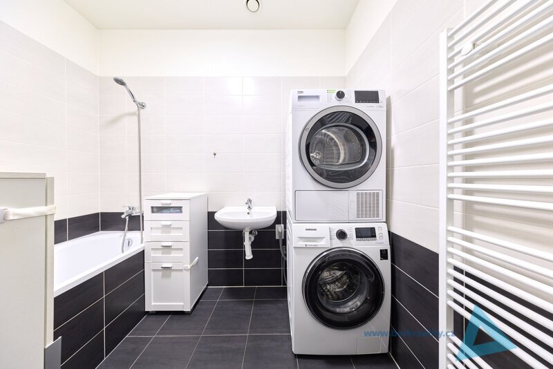 Byt je vybaven moderní kuchyňskou linkou se spotřebiči – myčka, trouba,