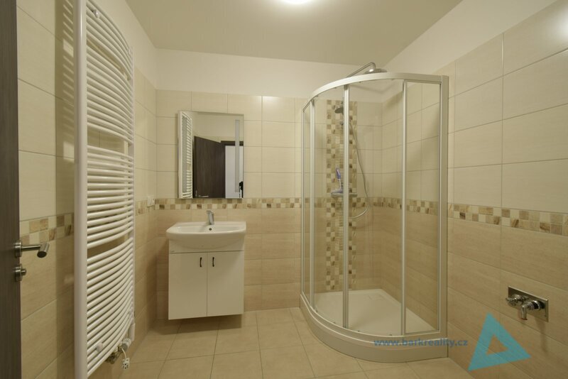 moderní sprchový kout, umyvadlo, topný žebřík a přípojku na pračku.